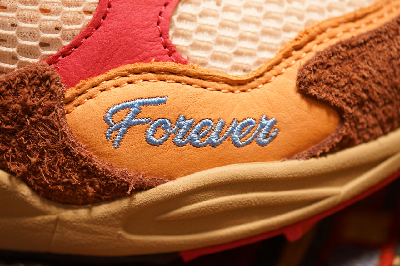 アッパーは毛足の長いスエードと天然皮革×メッシュのコンビ。ブラウン系がメインカラーとなっていますが、アクセントとしてサイドのリバーマーク周りをピンクっぽいレザーで囲んでいます。ヒール周りも同じカラーを採用。ブラウン系に濃いピンクの組合せは相性が良いので納得なのですが、そこにグリーンを差してくるのはJAE TIPSならではのセンスということなのでしょうか?僕この人のことなんも知らないけど。