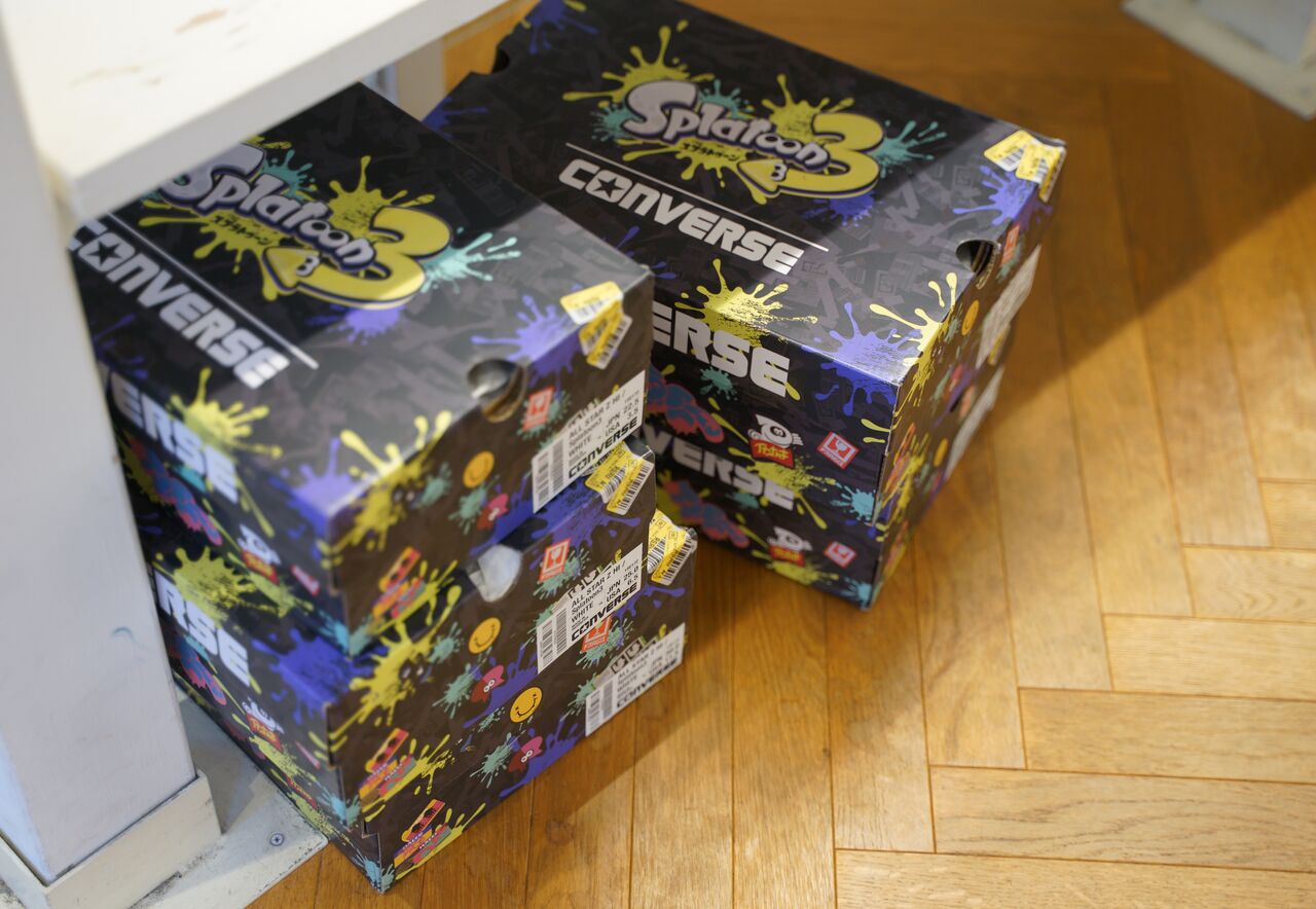 んで、スプラトゥーンといえばゲームに出てくるフクやクツ等のギアがオシャレで人気のモデルなんかだと実際に着れる服として販売されていたりすることもあるのですが、今回はコンバースとのコラボでスニーカーが発売されることになりました。