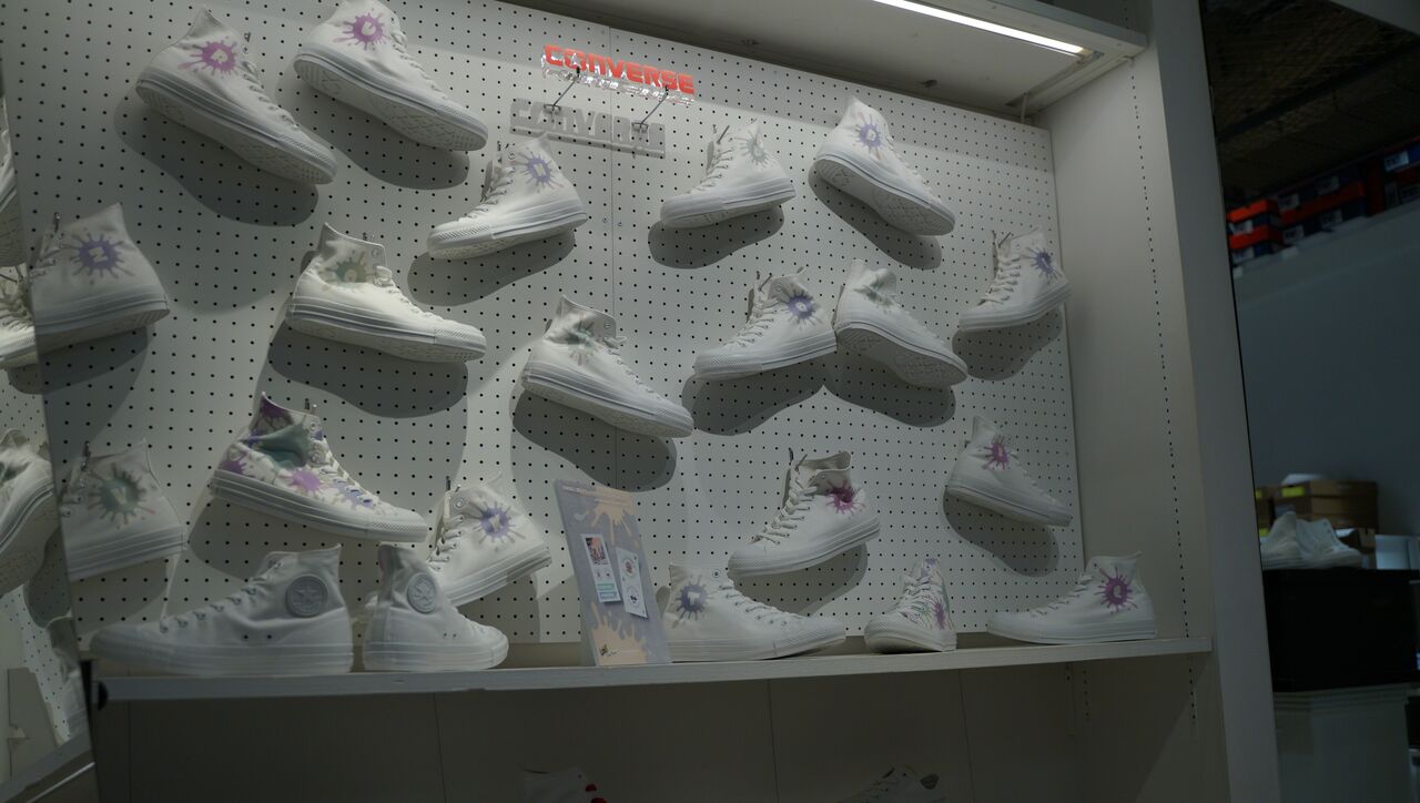 店舗のB1Fにあるカスタマイズコーナーで使用するホワイトオールスターに淡いカラーのインクが映える。たぶんこういうインク柄の生地を作ったんだろうな。インク柄の部分はみんな一緒じゃなくて若干個体差がありそう。イ
