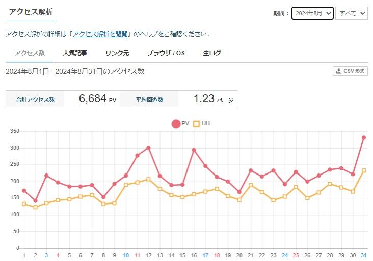 7月のアクセス数からいきなり2倍近くに増加。アディダスのスニーカーでの検索がメインなのとスプラ3のコラボでコンバースのスニーカーをオーダーした記事にアクセスが集中していた感じ。あとはHOKAのORA PRIMの新カラーが出たことでサイズ感に関する検索が増えたかな。9月もこのくらいのアクセス数を維持できればなと思います。