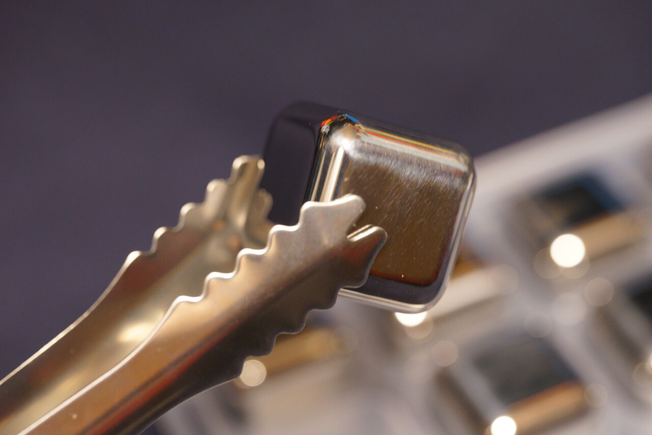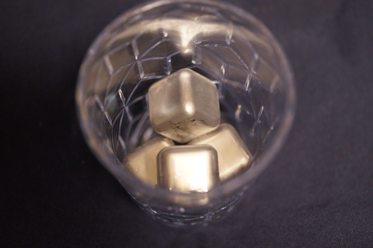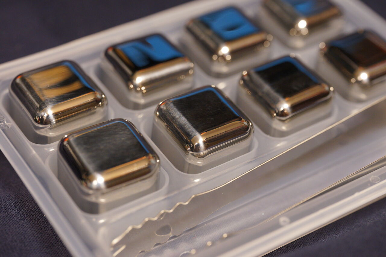 材質は「SUS304」という高耐久なステンレスを使用。表面は滑らかで角も丸くなっているのでグラスを傾けたときにキューブが動いて口に触れることがあっても違和感は無さそう。金属製のトングが付属しているが、これちょっと使いにくい。キューブが滑らかなので上手く掴めない時がある。トングは先端がラバー製になっていた方が良いと思った。