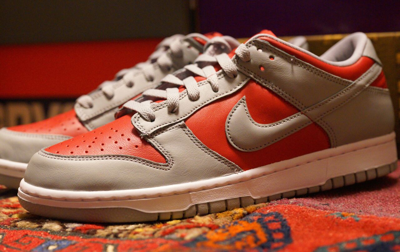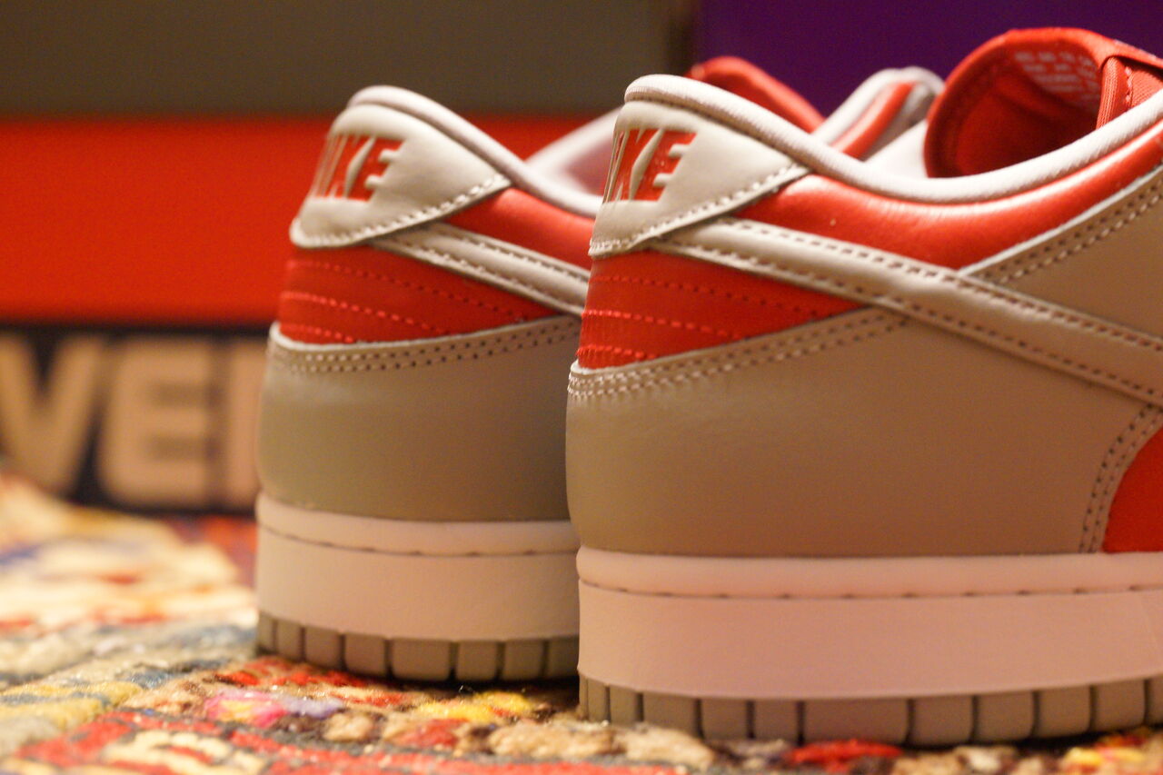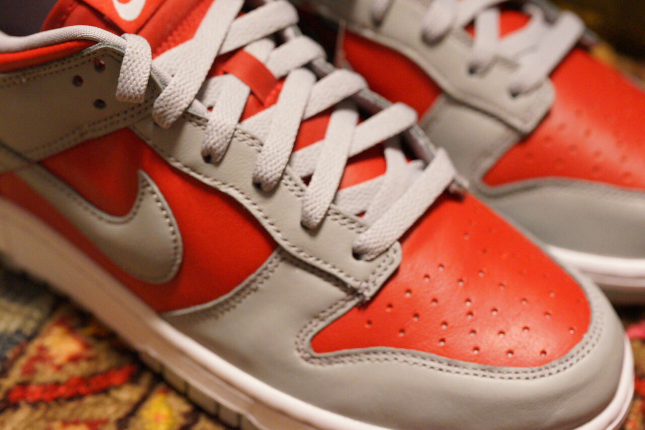 アッパーはオーバーレイにグレー。アンダーレイにレッドのスムースレザーの組合せ。元ネタはダンクのカレッジカラーの一つであるネバダ大学ラスベガス校で使用されたレッド×グレーのカラーを反転させたものとなります。以前購入した裏ダンクの「リバースカレー」と同様にレザーは通常のダンクよりも質が良さげ。適度な光沢感と触った時のしっとり感とか好き。しっとり感は個人の体感によるものが大きいかも。