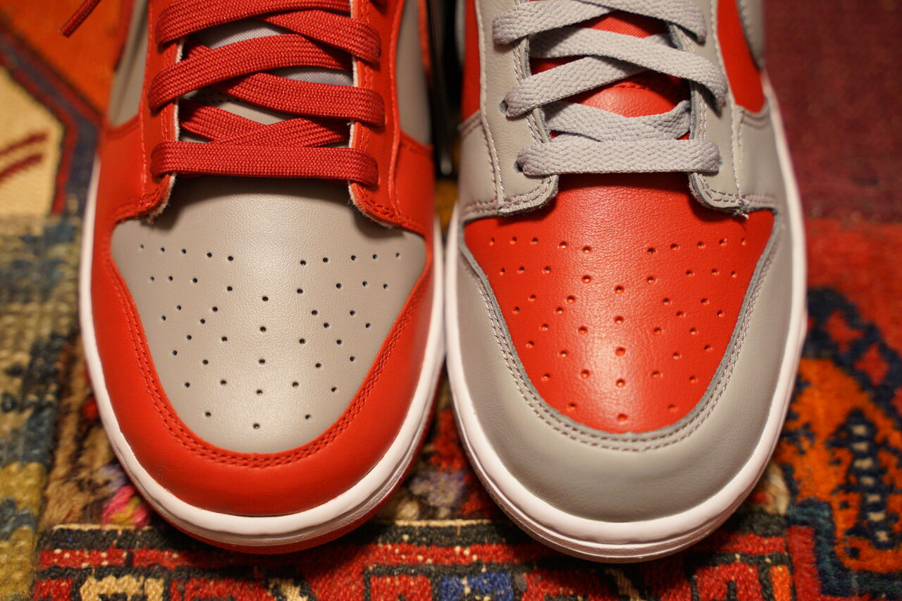 こうやってUNLVダンクと見比べて見るとグレーのカラーが微妙に違うかな。UNLVダンクのグレーは少し赤が混じったグレーで裏ダンクの方のグレーは少し青が混じったグレーっぽく見える。UNLVダンクはグレーの周辺のオーバーレイがレッドなのでそういう風に見えてしかもしれないんだけど、肉眼でみるとグレーは同じグレーと言う感じはしない。