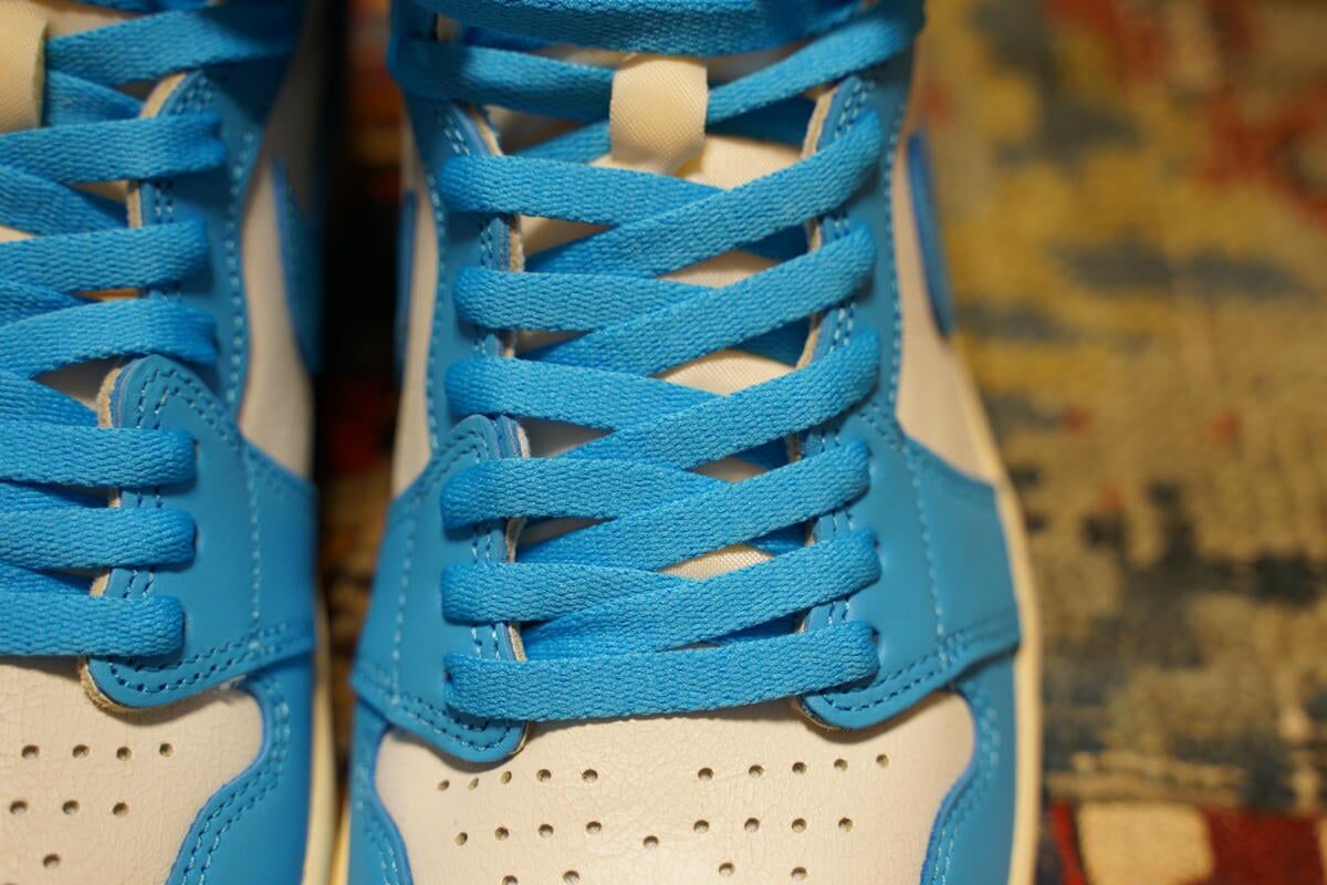 アッパーはスムースレザーとクラック加工がされたレザーのコンビ。カラーはライトブルー×ホワイトの通称「UNC」と呼ばれるアメリカのノースカロライナ大学のカレッジカラーでまとめられています。このブルーの部分はモデルによって名称が異なるんだけど、今回は2015年に発売されたAJ1 OG UNCと同じ「ダークパウダーブルー」となっていました。ただ、2015年のモデルと比べるとブルーが若干薄くなっているかな。